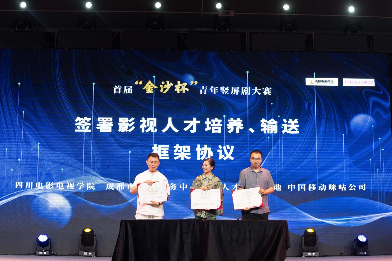 中國移動(dòng)咪咕公司咕咕工作室短劇制片人黃振民 (左)、四川電影電視學(xué)院黨委副書記、副校長羅思(中)、成都市影視服務(wù)中心人才孵化基地負(fù)責(zé)人張易(右)簽署影視人才培養(yǎng)、輸送框架合作協(xié)議